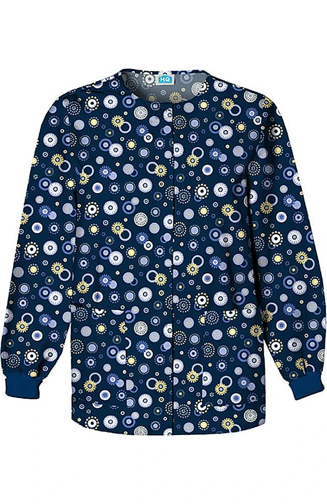 This warm up scrub jacket is from Cherokee’s Scrub H.Q. It has a snap front closure. There are large patch pockets to hold all your gear and a peek-a-boo cellphone pocket. You will stay cozy with the soft knit cuffs.