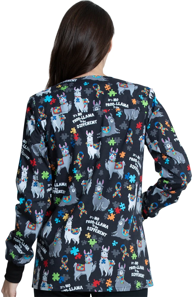The Fashion Prints by Cherokee Women’s Llama Love Print Scrub Jacket is an adorable reminder to celebrate what makes us different. The Autism Awareness puzzle prints and llama characters makes for an unforgettable look.