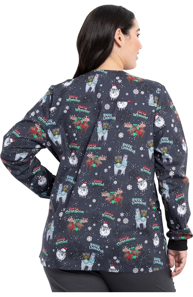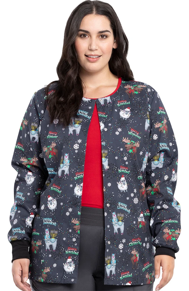 Deck the halls in the Fashion Prints by Cherokee Women’s Merry Whatever Print Scrub Jacket. This winter wonderland print scrub jacket is perfect for all denominations.