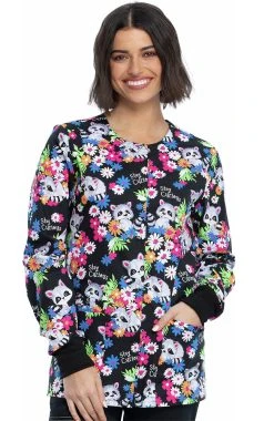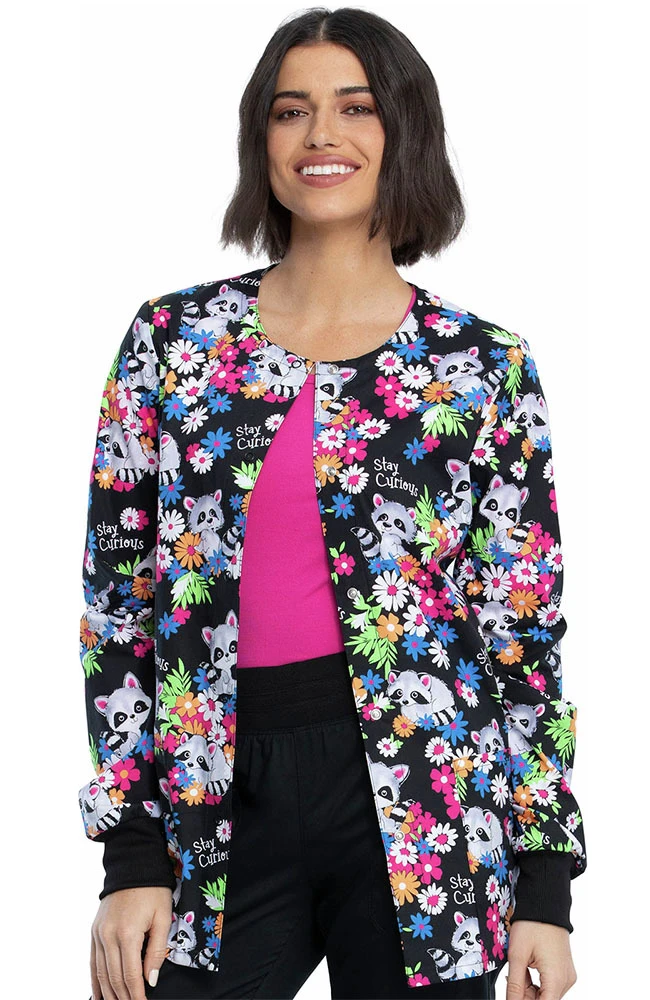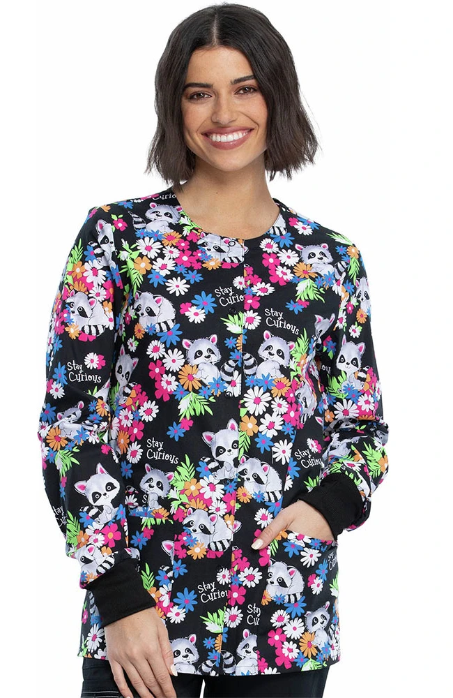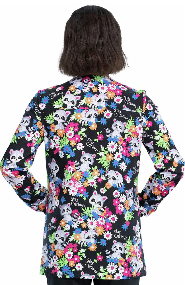 Be a life-long learner in the flattering, Fashion Prints by Cherokee Women’s Stay Curious Print Scrub Jacket. This beautiful raccoon and floral print is the perfect solution to your everyday workwear needs.