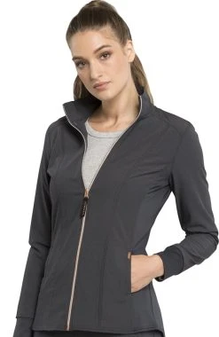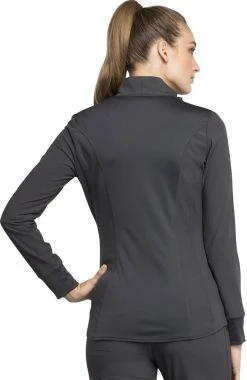A sleek fabric combination adds a luxurious look and feel to the STATEMENT by Cherokee Women’s Zip Front Solid Scrub Jacket. The stand collar and cool construction provide an athletic touch.