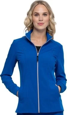 A sleek fabric combination adds a luxurious look and feel to the STATEMENT by Cherokee Women’s Zip Front Solid Scrub Jacket. The stand collar and cool construction provide an athletic touch.