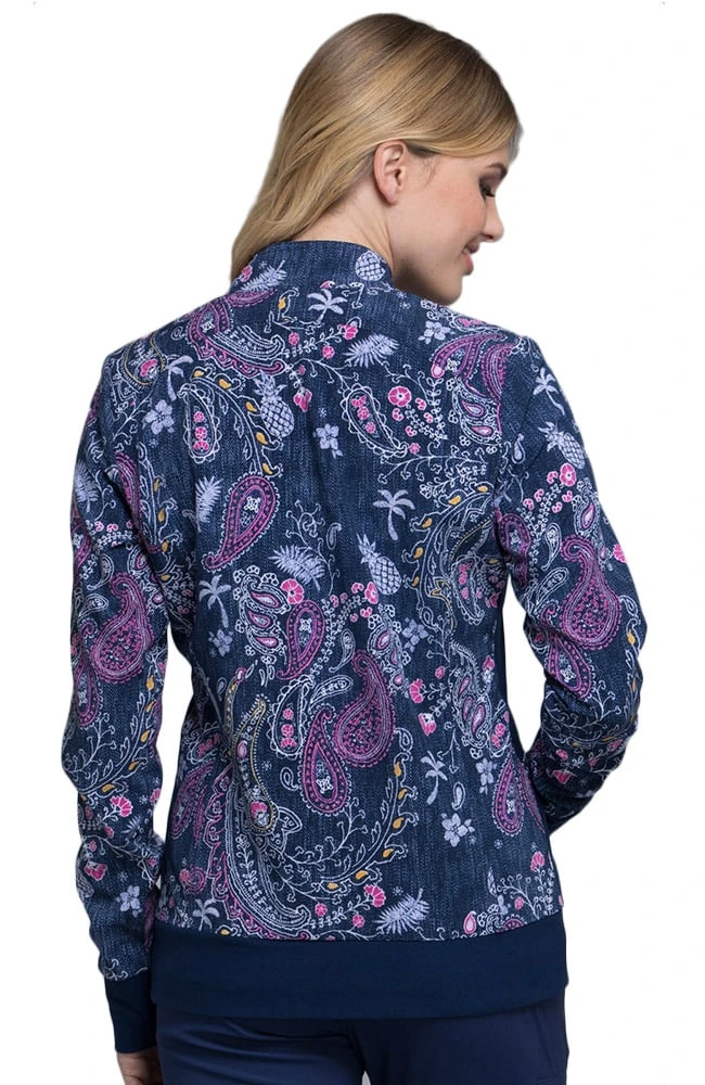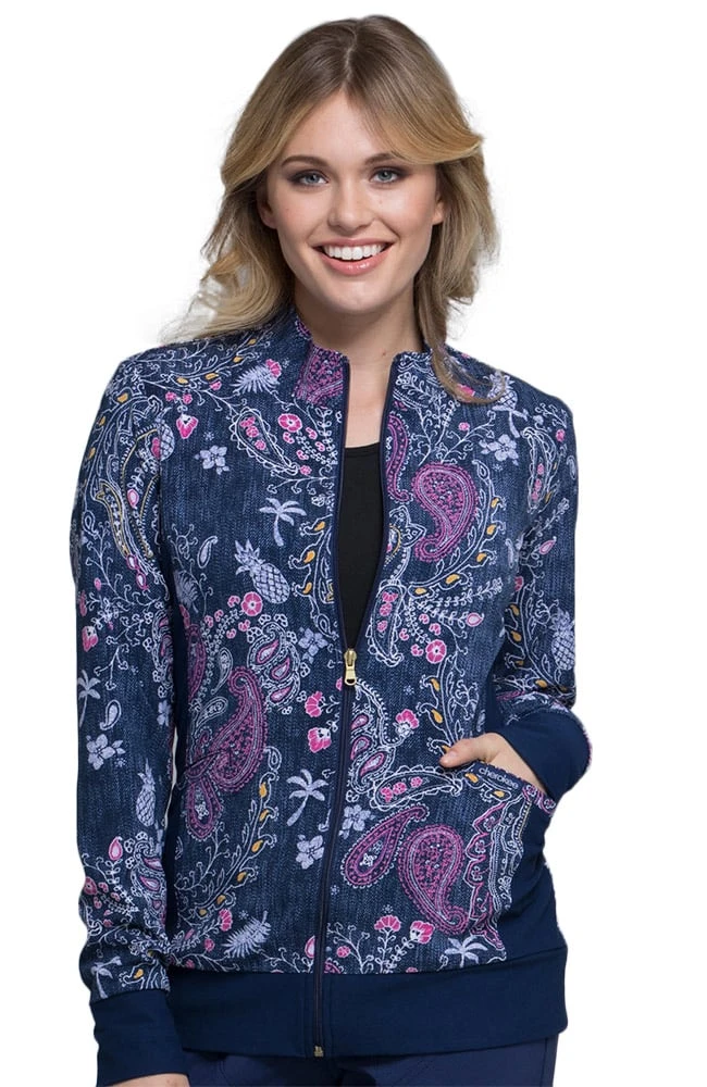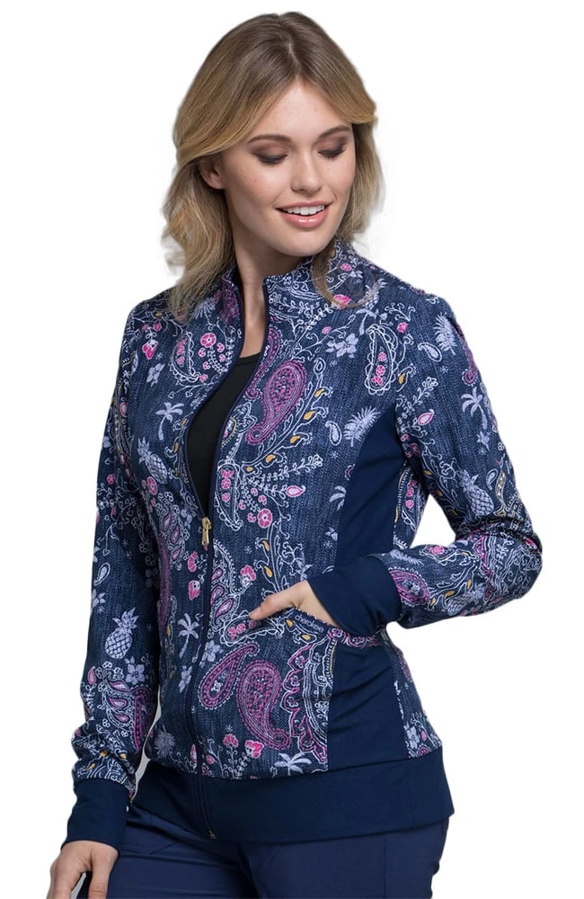 This Fashion Prints by Cherokee Women’s Zip Front Warm-Up Floral Print Scrub Jacket turns classic into contemporary. Traditional paisley gets updated with a warm color palette and modern construction details.