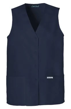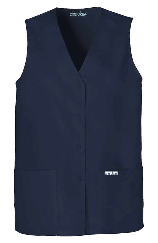 Cherokee scrubs are comfortable, durable, and designed to last. This sporty vest has button-front styling with soft, elastic shirring at the center back for a flattering shape. 2 roomy patch pockets hold all your gear.