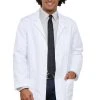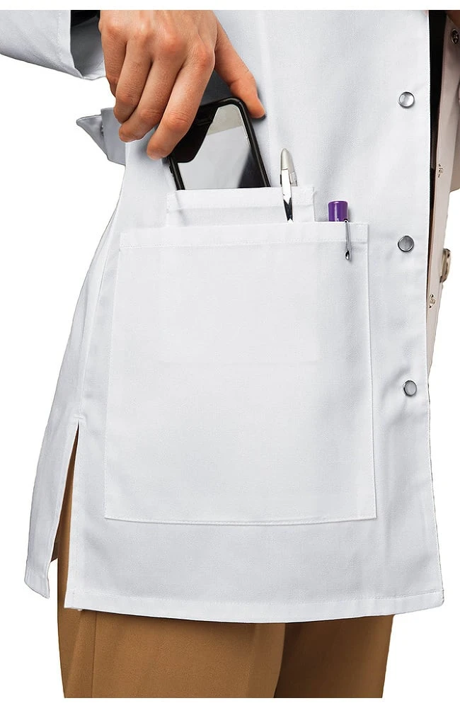 This classic notched-lapel lab coat with a snap front closure is from Professional Whites by Cherokee. Multiple pockets include 2 roomy patch pockets, a cell phone pocket and a chest pocket with a pencil stitch. It has a snap back belt detail and side vents. Princess seaming as well as front darts and a back yoke provide easy shaping.