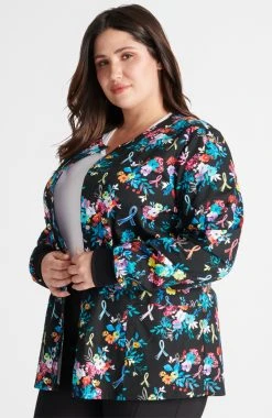 Spread positivity in the Fashion Prints by Cherokee Women’s Warm Up Hopeful Bouquets Print Jacket. This printed scrub jacket features a snap front closure, pockets for utility, and rib-knit cuffs for extra comfort.