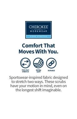 These unisex cargo scrub pants from Cherokee Workwear sport an adjustable drawstring waist and back leg seams. It has five pockets: two front patch pockets, a right side cargo pocket with extra cell phone/instrument pocket, and a back patch pocket. There is also an instrument loop above the right cargo pocket. The inseam is 31″. The fabric is a durable cotton/poly/spandex blend that has a touch of stretch for added comfort.