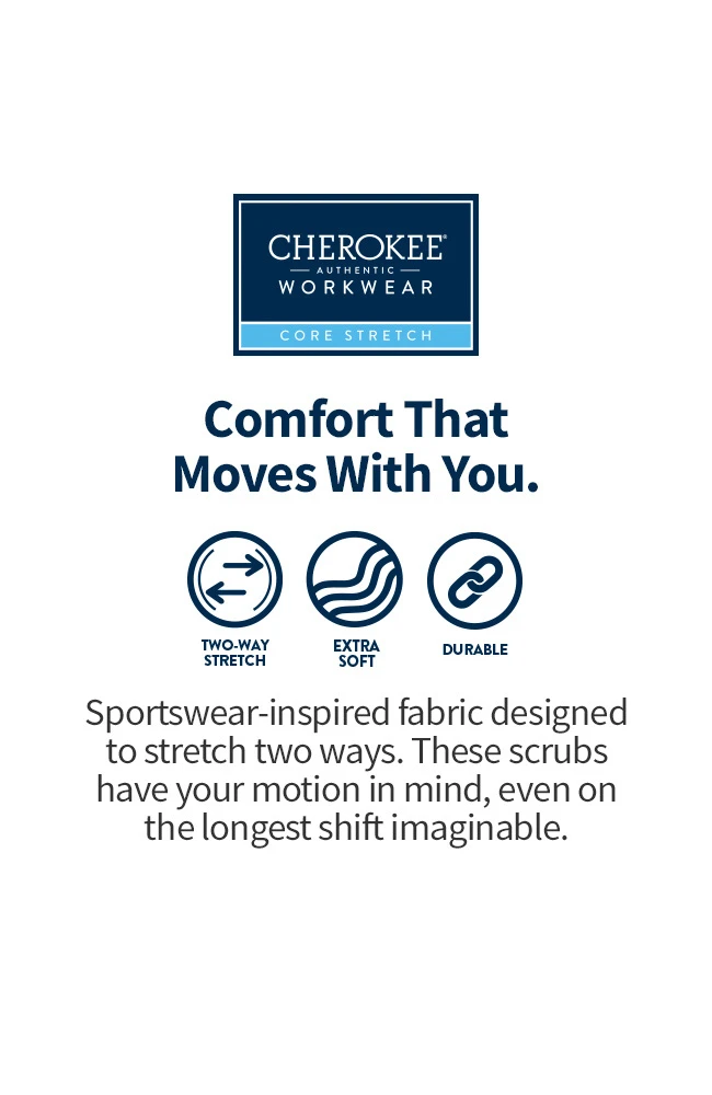 This jewel neck zip-front warm-up scrub jacket from Core Stretch by Cherokee Workwear has a touch of stretch. It features two patch pockets, the right side pocket is layered with a sectional pocket and I.D. loop. The flattering fit is shaped by a yoke and princess seams at the back, and raglan seams at the front. Matching knit cuffs make it cozy. The center back length is 27″.