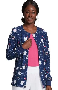 The EDS Signature by Dickies Women’s Snap Front Flossed In Space Print Scrub Jacket lets you reach for the stars, with dental and ‘flossy’ characters. The stunning Flossed In Space print adds some sparkle to a classic dental scrub jacket.
