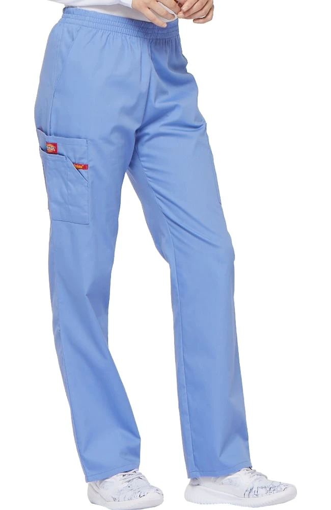 The 86106 is a natural rise, pull-on scrub pant from Dickies EDS Signature collection with a tapered leg. There is all around elastic at the waistband. There are front slash pockets and cargo pockets. The right hand pocket is layered with and additional sectional pocket and an instrument loop. There’s also a flexible knit interior pocket.