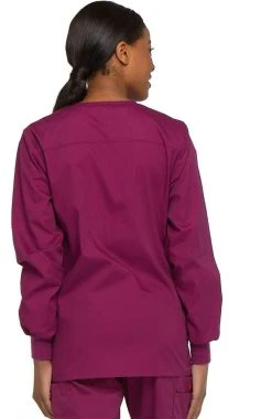 This cozy round neck scrub jacket from Dickies EDS Signature collection has a snap front. There’s also an instrument loop on the left pocket. Knit cuffs keep out the chill. Extra style comes from a back yoke and side vents. Center back length: 28 ½””.