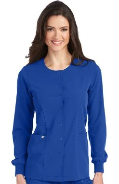 A basic piece with a beautiful shape, the 2407 is a stretch scrub jacket from Grey’s Anatomy’s Signature. It has princess seams and a fitted back with partial belt. This round neck warm up has a six snap closure. It also has banding at the sides, front pockets and knitted cuffs.