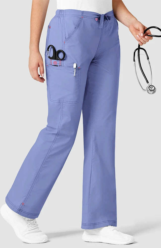 The Grace from WonderFlex by WonderWink offers clean looks and outstanding comfort. They are made with a cotton/poly/spandex premium stretch blend fabric. WonderFLEX is a cotton-rich, premium fabric. It has enough give to be supremely comfortable while maintaining its shape for a polished look. It has a flattering flare leg cut, with front pockets, one cargo pocket and one back pocket. Triple needle stitching at the pocket openings protects your scrubs from tears. The back pocket has a mock dart and handy bungee loop for your accessories. Double-needle stitching at the side seams adds durability. The waist has back elastic and a full drawstring so you can create your ideal fit. Vents at the bottom hem.