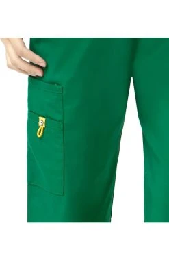 A universal favorite, this classic, relaxed pull-on cargo scrub pant from WonderWink has a comfortable fit through the seat and thigh, widening slightly below the knee. Extra pockets add functionality. There are seamed pockets at the hips as well as cargo pockets on each leg. The pocket on the right leg is doubled and has an interior cell phone pocket and instrument loop. The elastic waist can be worn flipped over, revealing a contrast color.